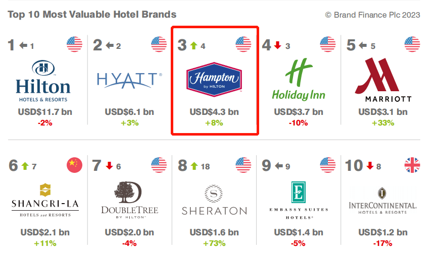 而围绕品牌的价值增长,就在本月,由国际权威品牌价值评估机构 Brand Finance 发布的“2023年全球酒店品牌价值”榜单新鲜出炉。希尔顿欢朋以43亿美元的品牌价值位居榜单第三,在排名较去年跃升1位的同时,超越假日酒店位居中高端品牌第一。