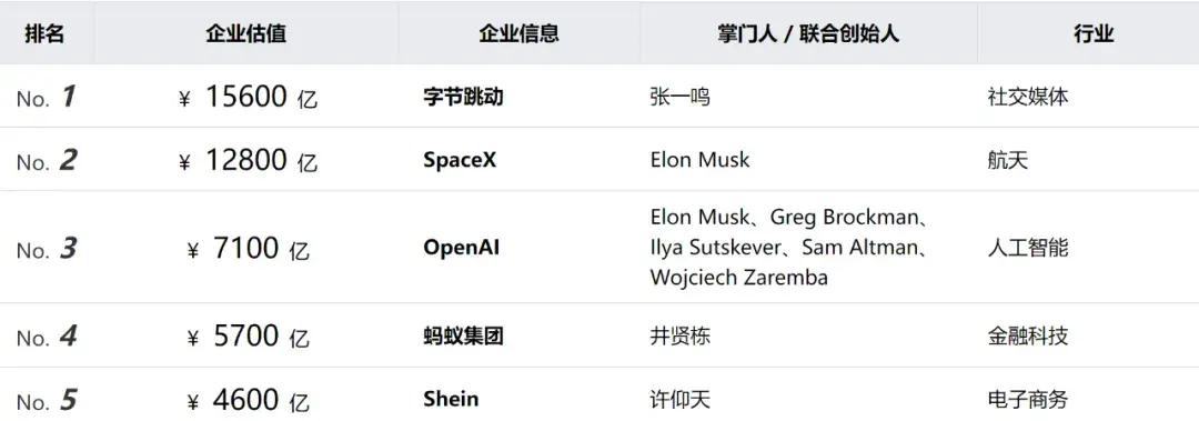 《2024胡润全球独角兽榜》Top5 Open AI位列第三 图源:胡润百富