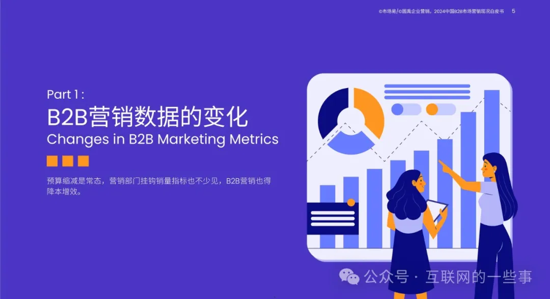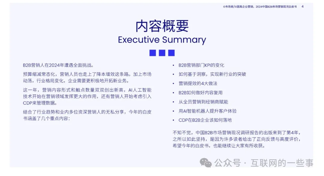 市场易与圆禹企业营销联合策划发布的《2024中国B2B市场营销现况白皮书》,旨在从多个维度追踪中国B2B营销环境的变化,通过对近300名B2B营销人员的调研,我们深入探讨了大环境变化和AI技术革新对行业的影响,以及这些变化如何具体地改变了营销人的日常工作。报告主要内容如下: