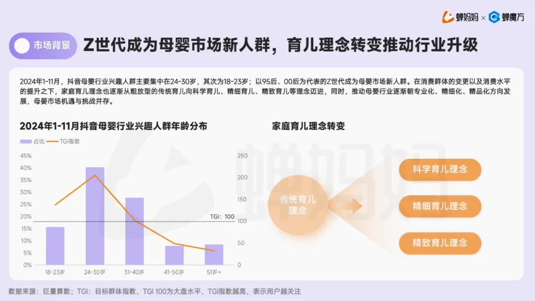 今日,为大家分享由蝉妈妈&蝉魔方发布的《2024抖音电商母婴行业分析报告》。随着社会经济的发展和消费观念的转变,母婴市场正经历着前所未有的变革。特别是在以95后、00后为代表的Z世代逐渐成为育儿主力军的背景下,家庭育儿理念从传统的粗放型转向了更加科学、精细和精致的方向。这一变化不仅重塑了消费者对母婴产品的期望,也推动了整个行业的升级与发展。
