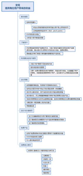 我们继续增长黑客的拆解,结束了激活与留存之后,我们分析一下变现的部分。变现部分的结构隐隐然已经将4P做了一个归纳。(见变现部分导图)