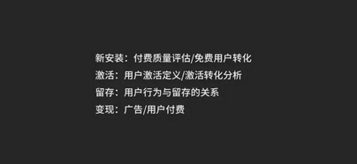 我们的付费量级很大一部分是来自于广告投放,当然,像趣头条的用户裂变模式,我们也认为是一种付费买量的方式,只是费用给了用户。在这里,我们的数据分析核心工作是两点:渠道转化与质量评估。