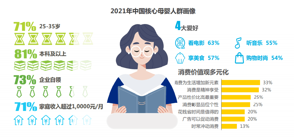 根据艾瑞咨询和微博大数据的联合研究显示,现在的核心母婴消费人群具有年轻、高知、高收入等特征,具备较高的消费能力,通过娱乐、美食和购物的方式享受生活,且消费价值观呈多元化。