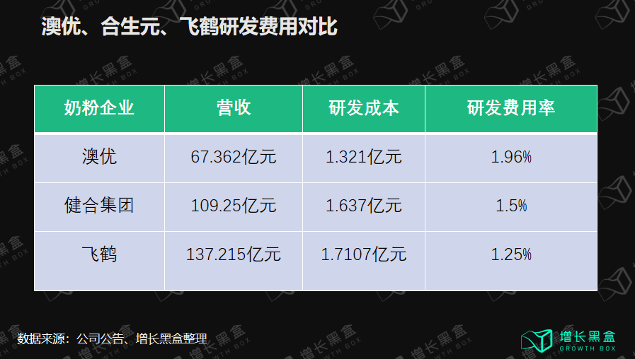 而澳优2020年的研发成本为1.321亿元,占营收的1.96%,拥有合生元的健合集团,其研发成本为1.637亿元,占营收的1.5%。二者的研发投入比均在飞鹤之上。