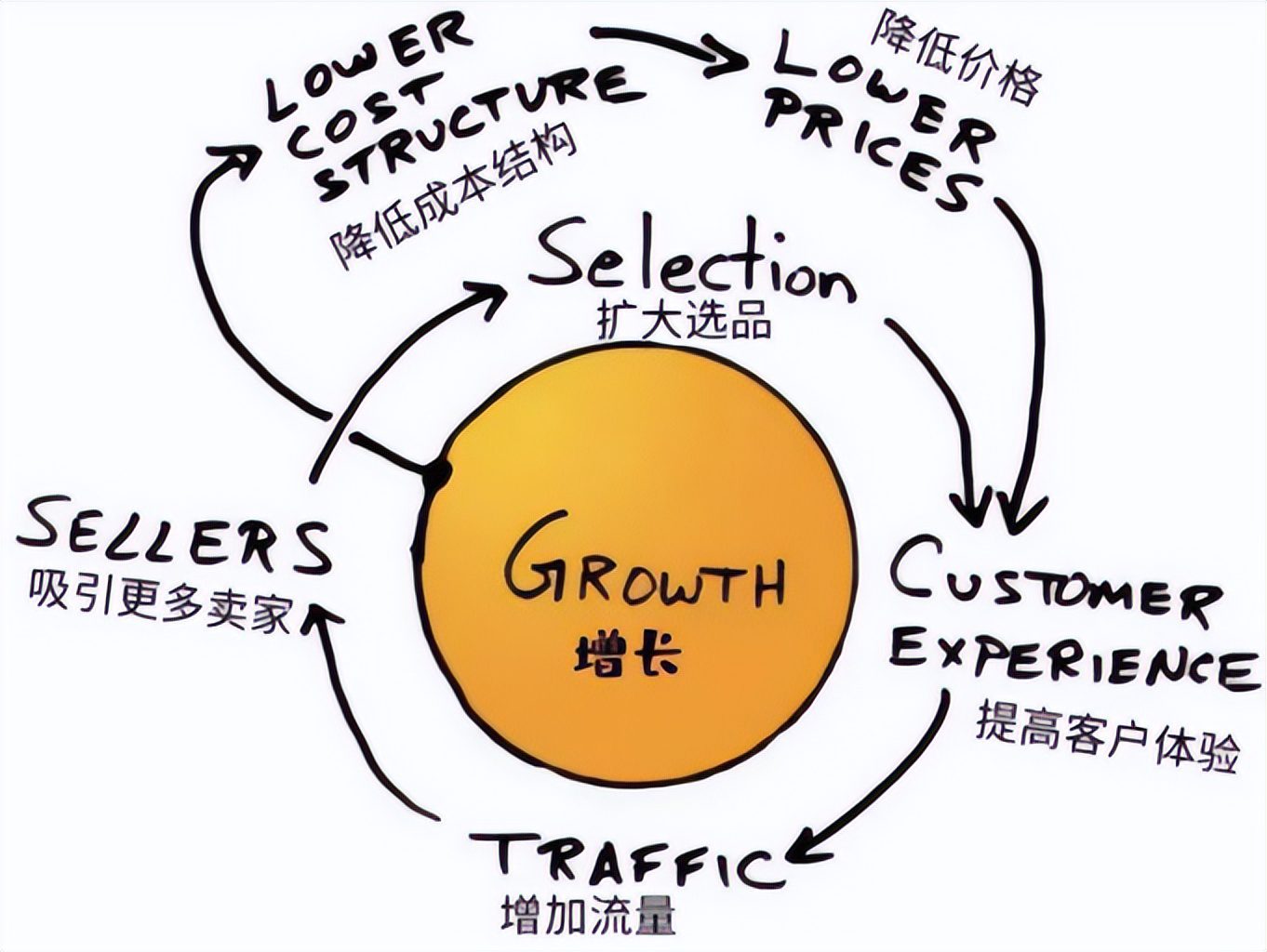 这一切都归功于贝佐期对亚马逊的定位,以及商业模式的设计上,依靠的便是“增长飞轮”