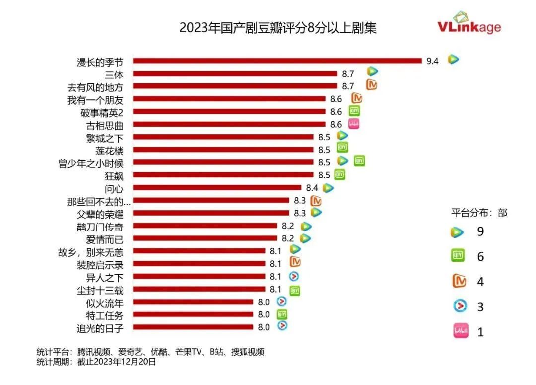整体而言,腾讯视频的优质内容数量在中国流媒体市场也名列前茅。Vlinkage统计的数据显示,2023年国产剧豆瓣评分8分以上剧集中,腾讯视频拥有9部,占比高达39.13%,位居第一。