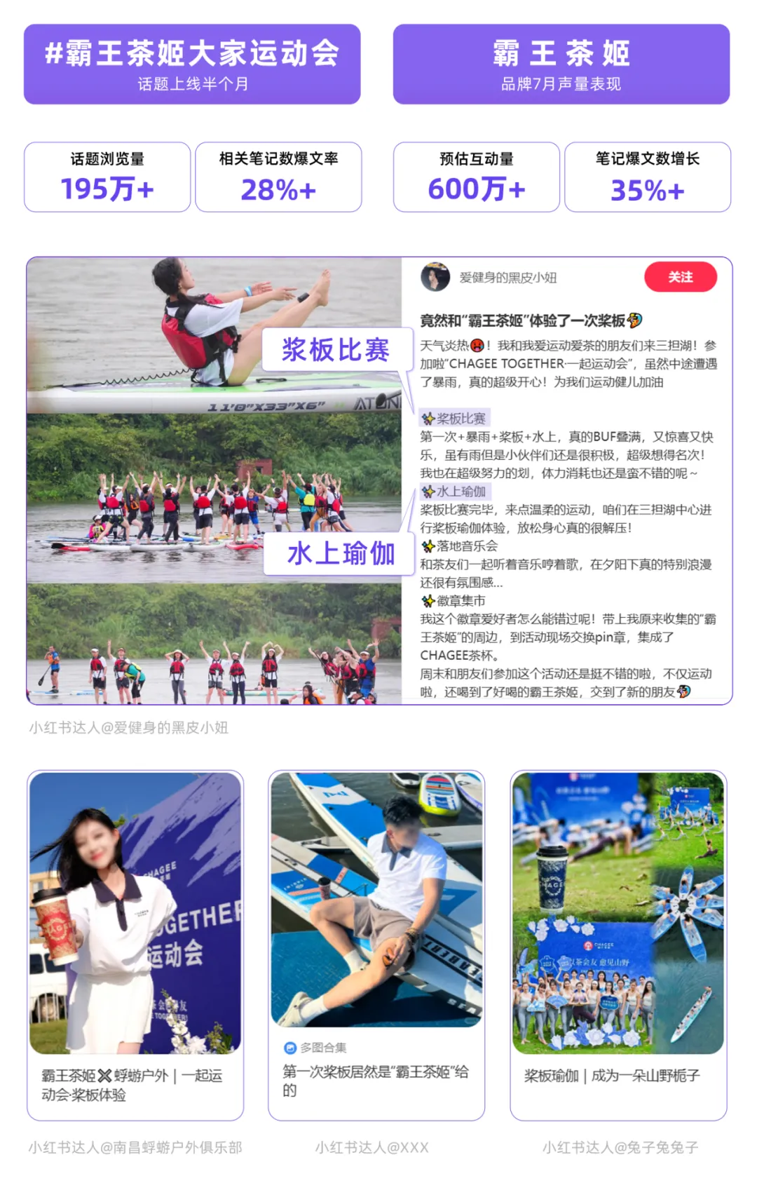 千瓜数据显示,#霸王茶姬大家运动会 话题上线半月,浏览量超195万、笔记爆文率超28%;#姬姐一起运动会洋芋国分会 话题登上小红书全站话题增量日榜TOP14;7月份品牌声量稳步提升。