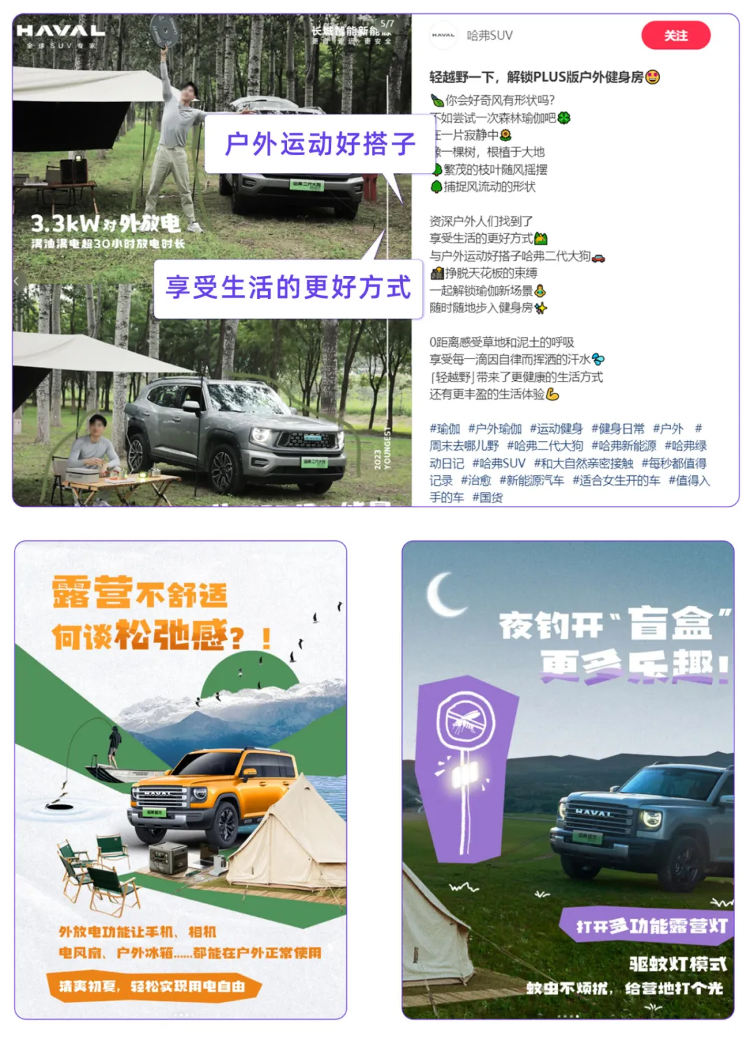 品牌通过“户外瑜伽疗愈、露营松弛感、夜钓趣味开盲盒”传播主题,营造例如“捕捉风流动的形状、0距离感受草地和泥土的呼吸、轻盈的生活体验”等一系列的内容场景,同时积极打造“户外运动好搭子”人设,拉近与用户之间的距离,提供陪伴感。