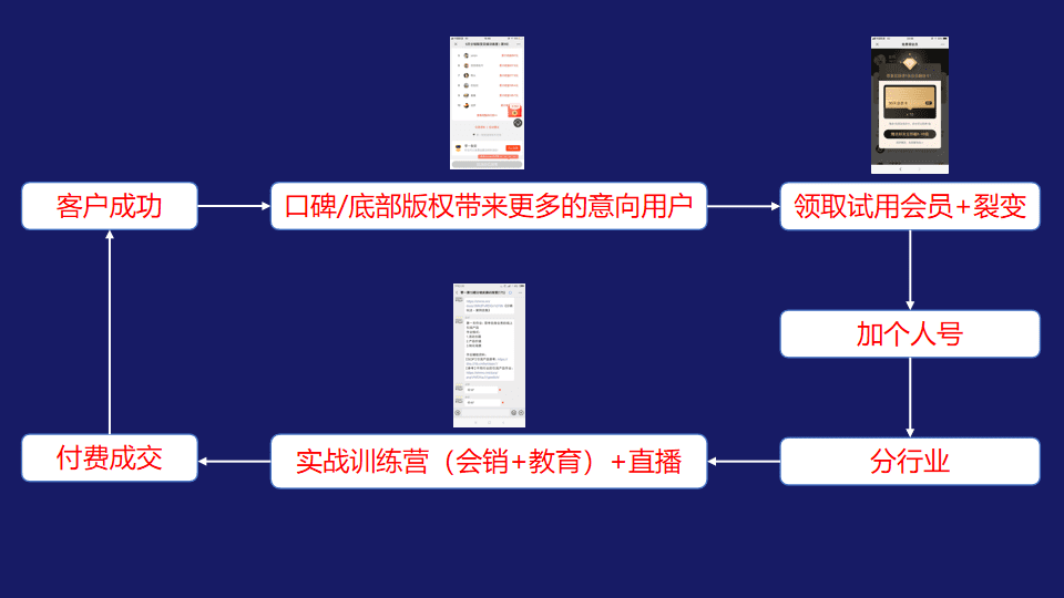 通过咨询、培训、代运营等一系列运营措施来帮助客户成功,形成口碑循环、不断裂变。不然如果复购率低于50%,团队则容易陷入疲于拉新的困境,如果毛利率低于30%则不能支撑团队长期投入研发迭代,导致恶性循环。