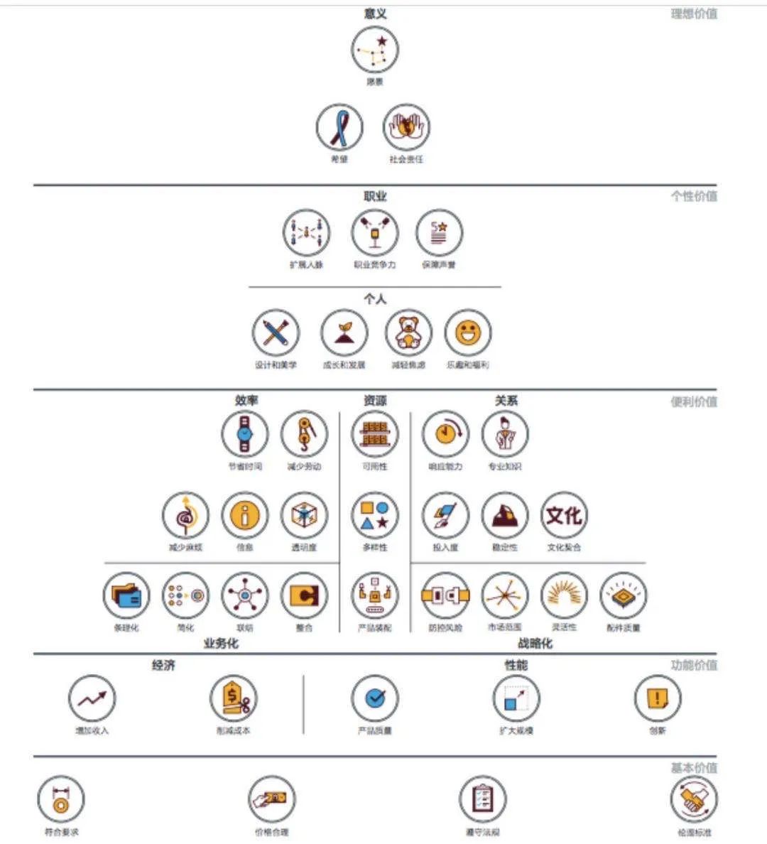 To B业务的企业顾客需求包括:基本价值、功能价值、便利价值、个性价值、理想价值。