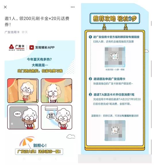 广发银行私聊最常见的活动,就是邀请用户参与推荐好友办卡领优惠的活动,只要把信用卡办下来,后续的付费转化自然就轻松许多。