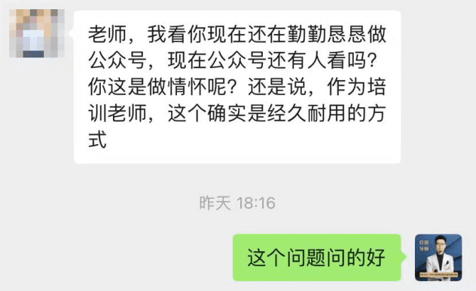 “老师,我看你现在还在勤勤恳恳做公众号,现在公众号还有人看吗?你这是做情怀呢?还是说,作为培训老师,这个确实是经久耐用的方式”