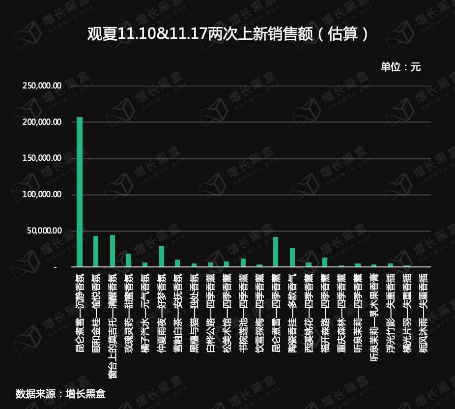 那么,观夏的众多产品中,又有哪些卖的最好呢?我们又对观夏11月10日和11月17日两个上新日的销售数据进行了分析。