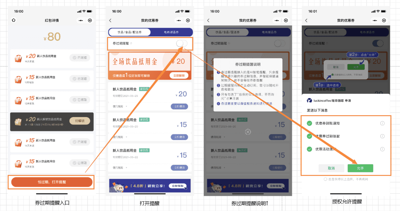 - 2、通过“微信服务通知”提醒用户使用优惠券,新人优惠券过期时间有间隔,培养新用户初期购买习惯的养成。