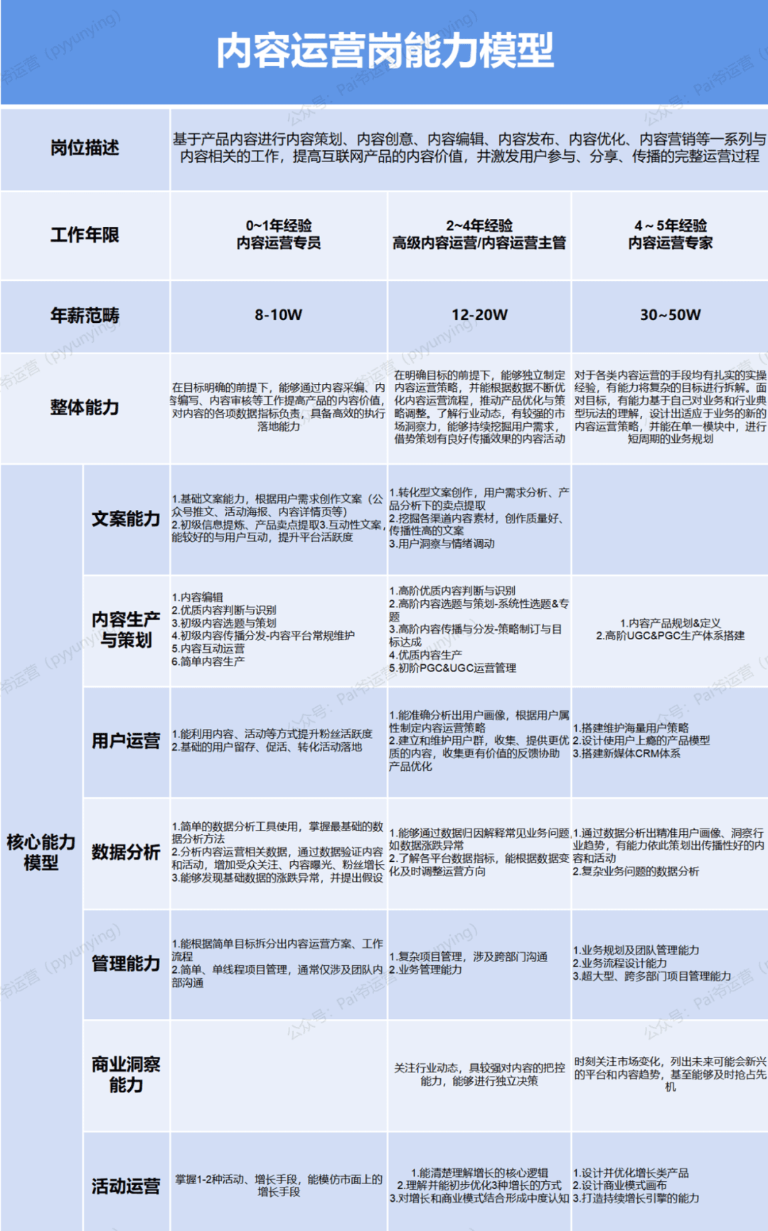 核心能力包括: 文案能力、内容生产与策划、用户运营、数据分析、管理能力、商业洞察和活动运营。