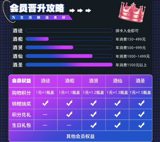 酒痴(年消费150-499):包邮、会员价、品牌活动、购物积分1元=1.1瓶盖、锦鲤抽奖、积分兑奖;
