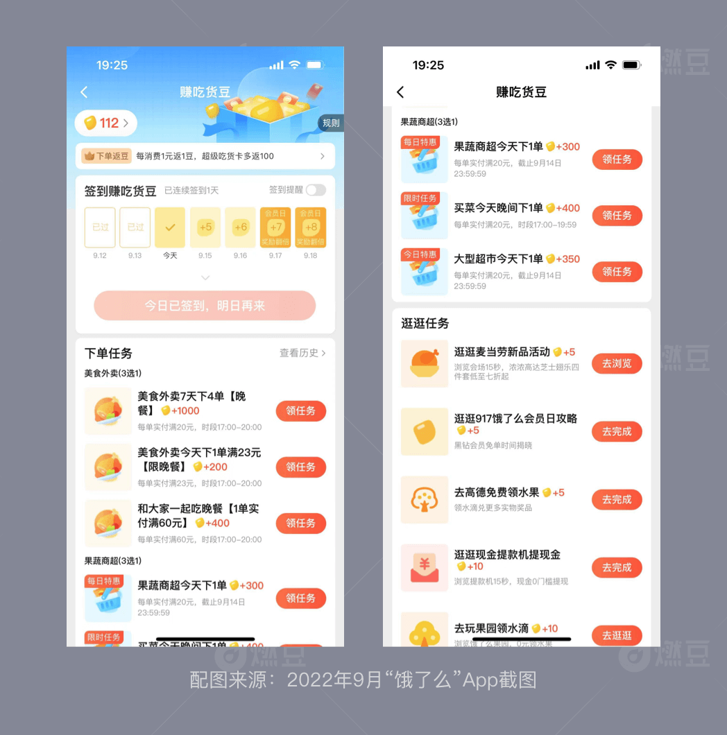 比如饿了么平台的积分任务分成下单任务与逛逛任务,下单任务引导用户直接下单,对于平台来说每笔都对应到收入,可以提升GMV、用户下单频次;而逛逛任务则提升了产品内各个其他重点频道,以及生态中其他产品模块的曝光,如果能做好有效承接,那么更多流量必然对应着更多商业价值;而饿了么如果设置评价获得积分(即吃货豆)的任务,笔者相信也会提升平台的评价质量及数量···