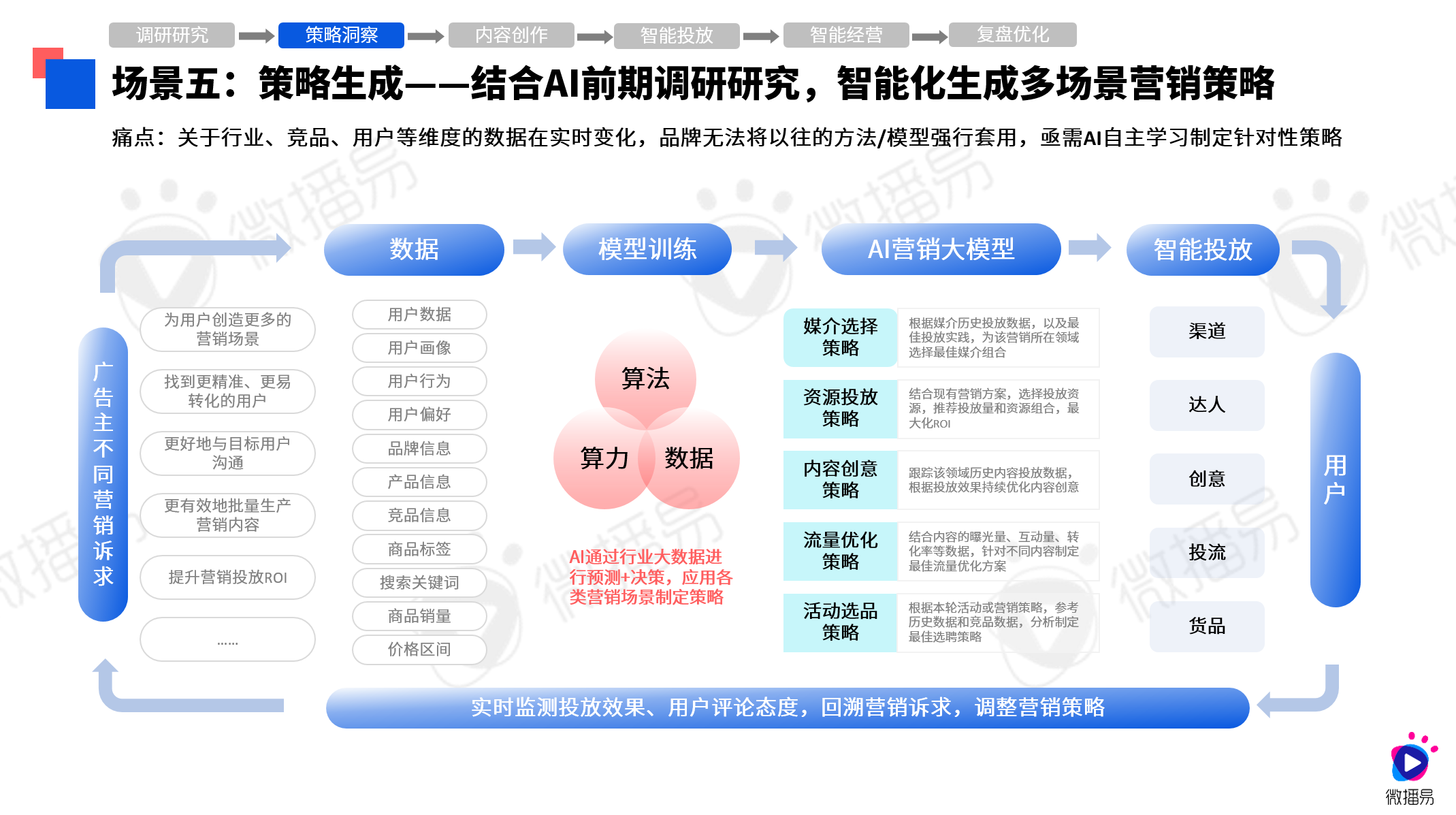 无论是媒介选、资源投放、内容创意、流量优化或者选品策略,AI营销可以通过预测+决策,灵活应用于各类营销场景。此外,AI还能实时监测效果产出,回溯品牌主需求和用户反馈,调整策略。