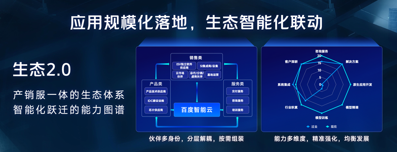 有了智能基础设施,如何构建可持续的生态体系,助力伙伴实现技术到商业价值的闭环?为应对合作伙伴在技术适配、商机获取及交付效率等方面的痛点,百度智能云以“多重身份、分层解耦、按需组装”为核心,构建产销服一体化的生态2.0体系。