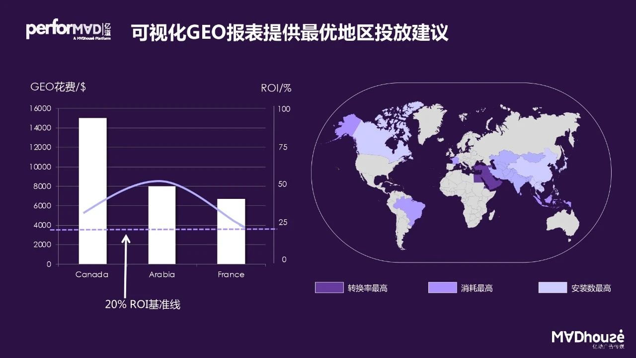 鉴于海外市场各个区域的差异化特点,PerforMad不仅提供独有的跨渠道多账户管理,更提供可视化GEO报表提供最优地区投放建议,以国家维度展示投放数据,以图表形式表现花费-ROAS趋势、安装量-安装/注册/购买单价趋势,根据广告主的需求分别遴选出「转化率最高」、「消耗最高」以及「安装数最高」的地区,供广告主挑选。