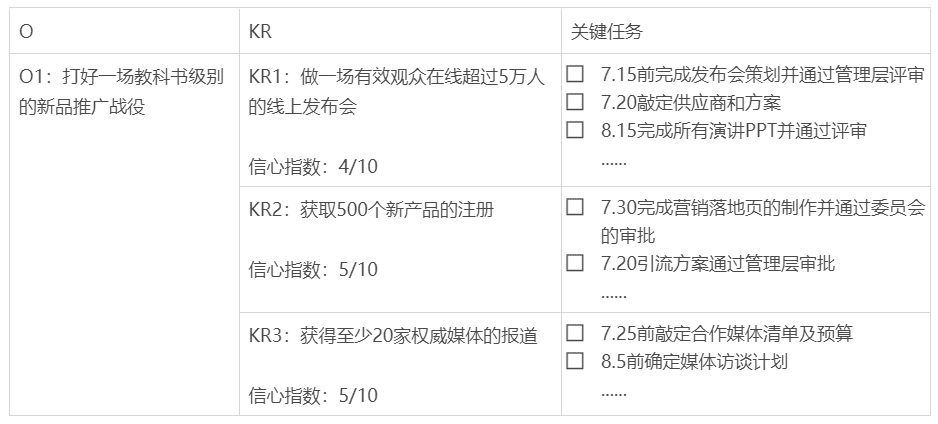 定完O和KR就丢到一边去了,但是OKR工作法中最大的精力就是在过程的管理,时刻保持目标,不断克服一个又一个的关键任务。
