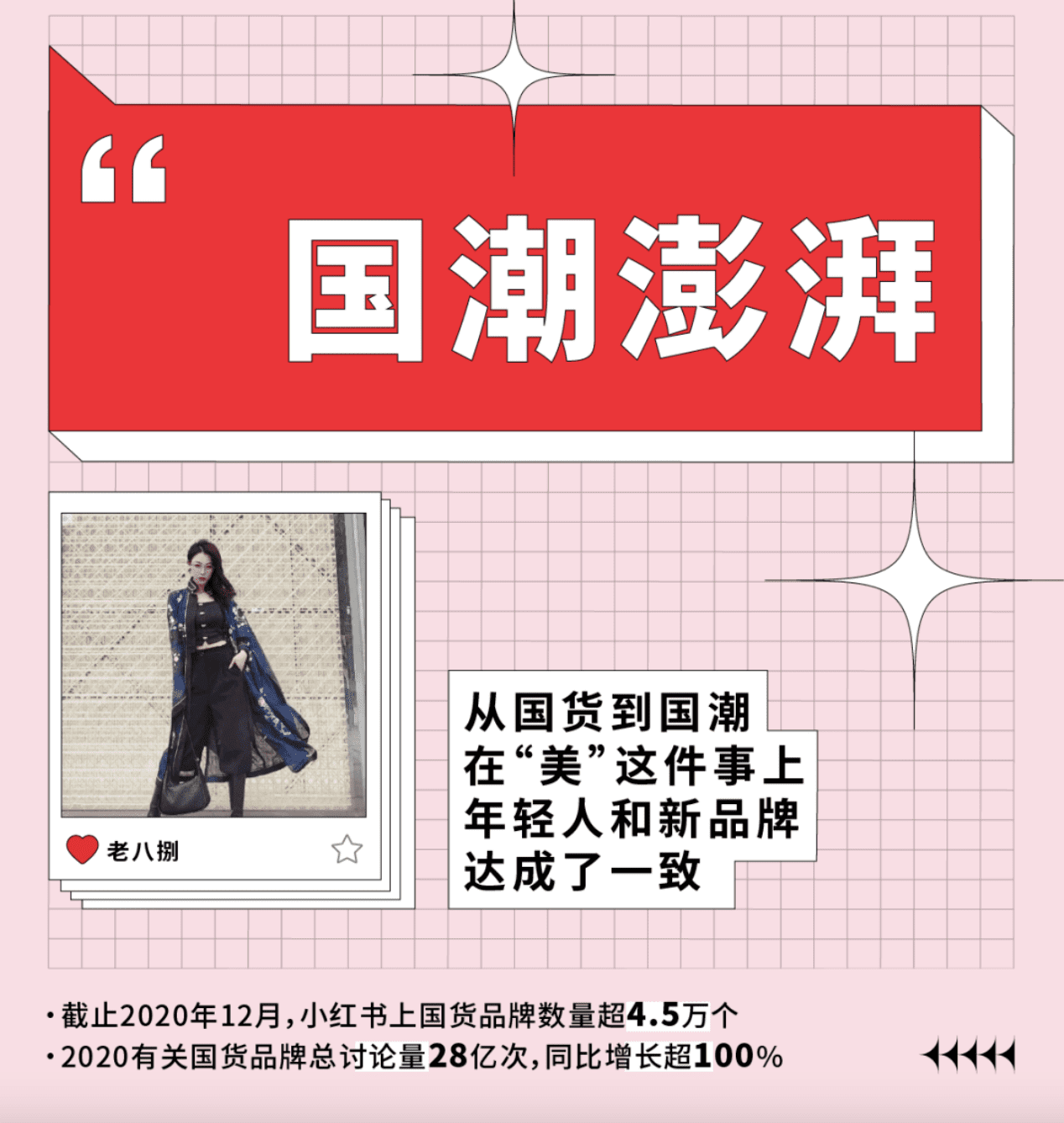 到如今,小红书发布《2021生活方式趋势关键词》,“国潮澎湃”已然位列其中。