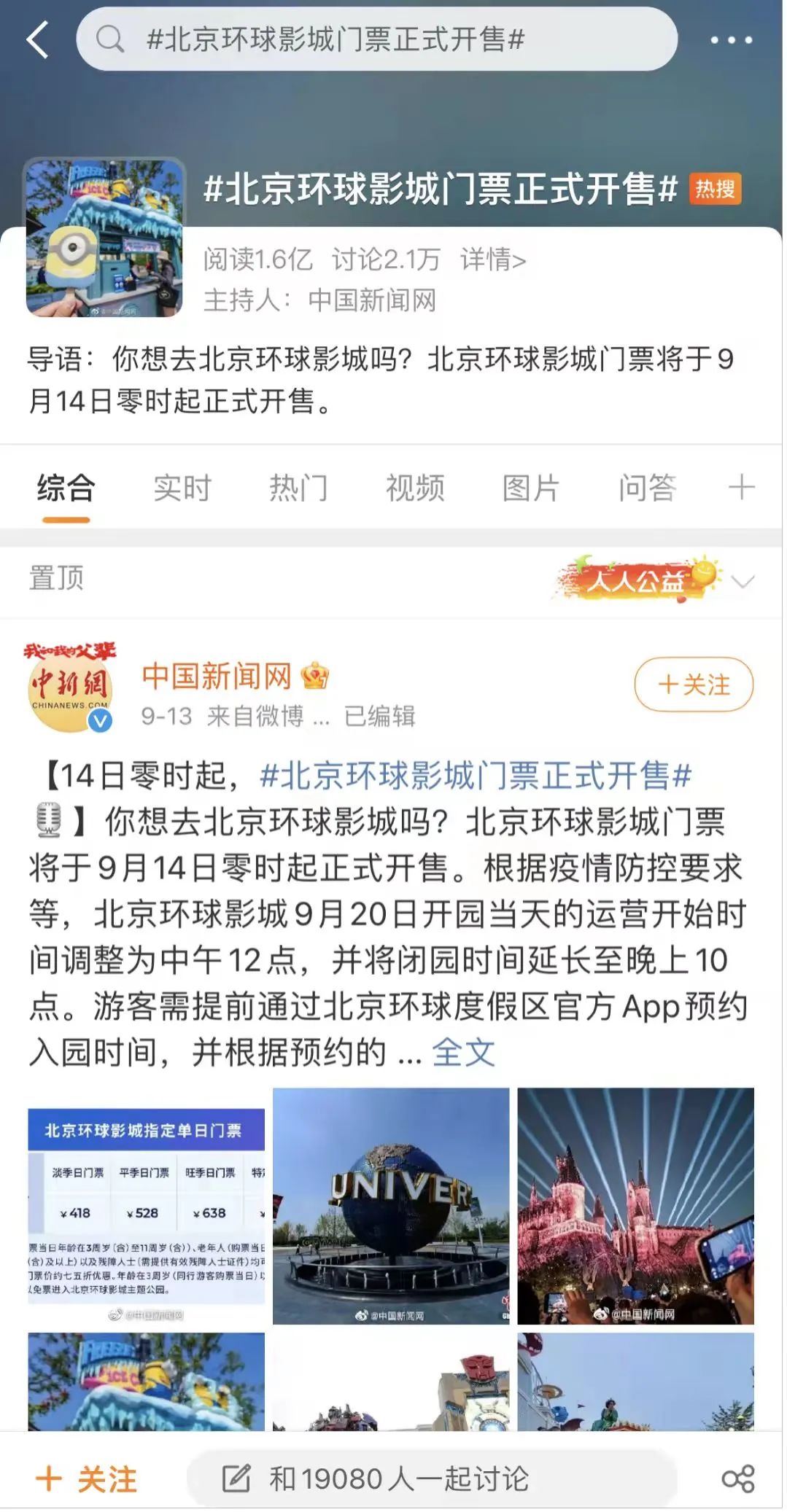北京环球影城从9月14日0时起,其官方App、微信小程序、各在线旅游平台等均同步开放北京环球影城的购票页面,在各大社交平台一度出现了“环球影城APP崩了”“飞猪北京环球影城优速通自动退票”等热搜,微博上“北京环球影城门票正式开售”等话题已经有1.6亿的阅读,2.1万的讨论。一时间赚足了存在感!