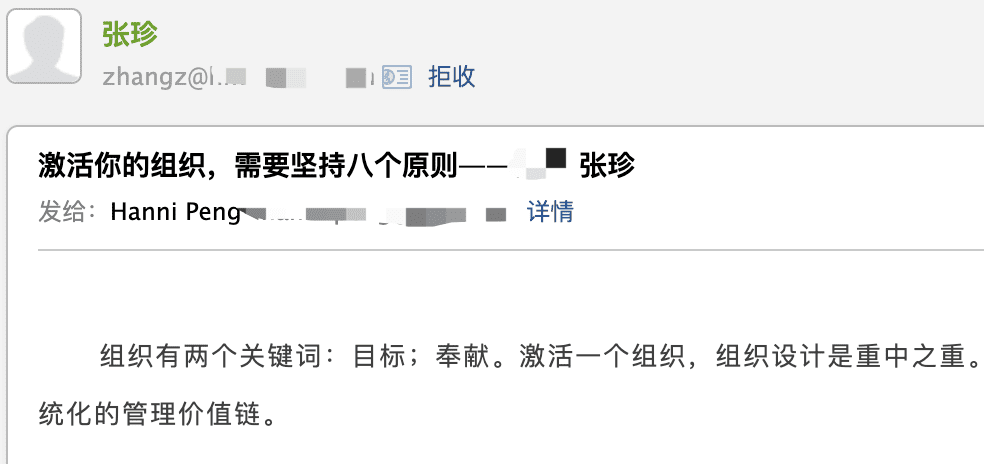 举个例子,我的邮箱常常会收到张珍的一封个人邮件,说真的我不认识她,但是一直没有删掉,有时候还会打开看看。她来自某家科技公司,但是她的邮件里从来就没有过自己公司的介绍,仅仅是在邮件标题中出现 XX张珍。