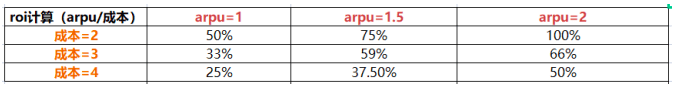 当然,如果你能用低成本买高价值的用户,说明买量能力和产品质量是不错的!这就需要优化师大量的经验积累,还有产品的伙伴不断完善app!我用一个形象的图表来展示不同成本、ARPU下的ROI关系。
