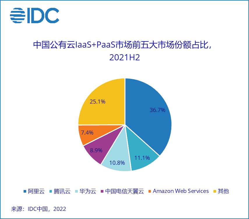 中国公有云laaS+PaaS市场前五大市场份额占比,图源IDC