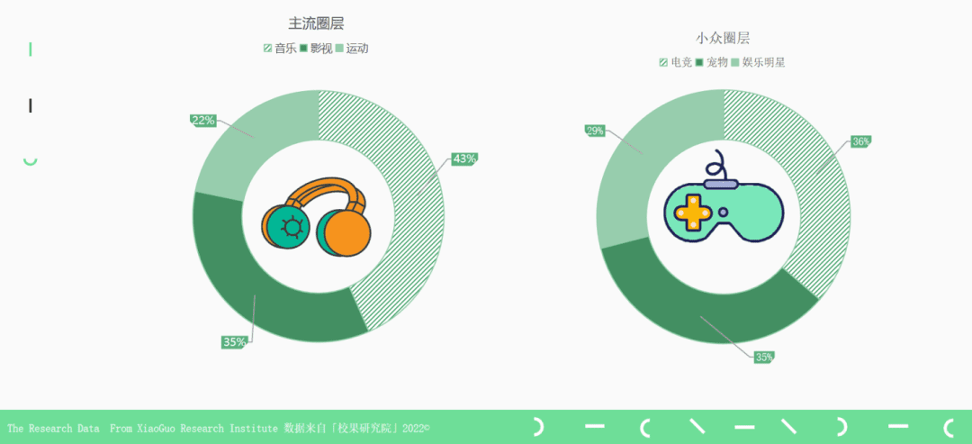 在校园生活之中,主流圈层三大爱好依旧是音乐、影视及运动,此外,小众圈层正在崛起,并日益被广泛喜欢。其中电竞、宠物、娱乐明星三大爱好占据小众文化圈TOP3,成为00后大学生的热爱兴趣标签。