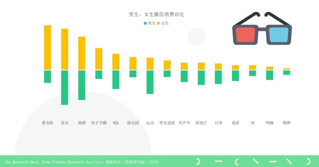 在精神消费层面,女生更热衷视频、音乐和看电影的消费,而男生更热爱视频、音乐和运动。此外,一些小众圈层社交方式,比如棋牌、VR、有声书、游乐园、密室逃脱等也正逐步被大家所喜欢。