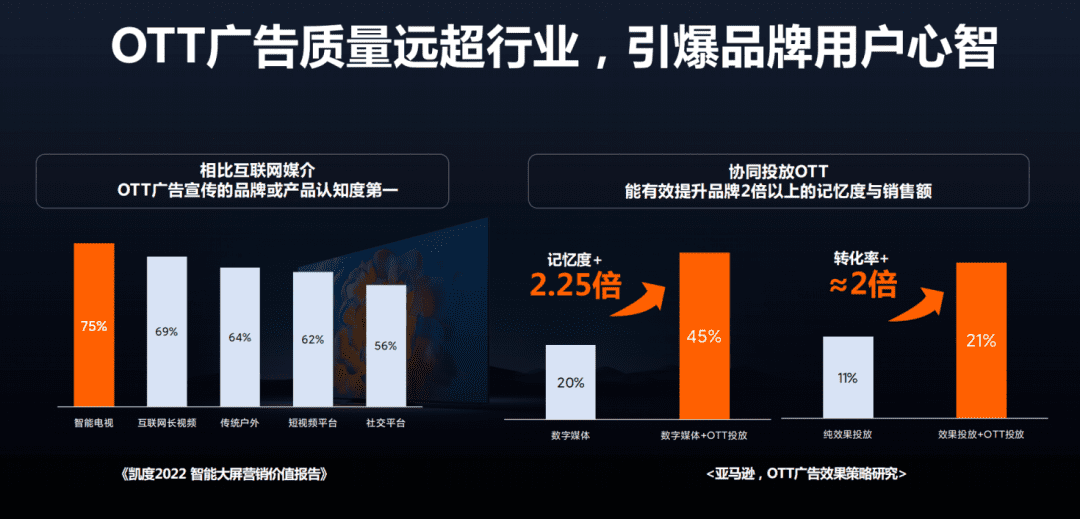 OTT大屏的媒介特性决定了它更适合优质广告内容的展示,结果就是OTT广告质量整体较高,流量x质量结合就是更好的“达标率”。 《凯度2022 智能大屏营销价值报告》显示,相比互联网媒介OTT广告宣传的品牌或产品认知度第一。《亚马逊,OTT广告效果策略研究》发现,在数字媒体基础上协同投放OTT广告,可有效提升品牌2倍以上的记忆度与销售额。