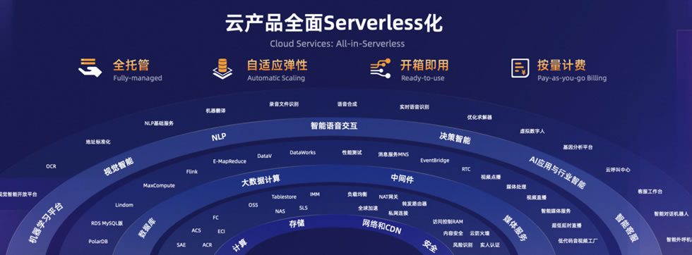 Serverless产品全系降价,包含函数计算FC降价最高降幅93%,数据库Serverless版折扣价、包月价都有不同下调,先后发布中间件Serverless版、大数据Serverless版等,前者相比预付费,客户成本降低30%-50%,后者降低60%-70%。