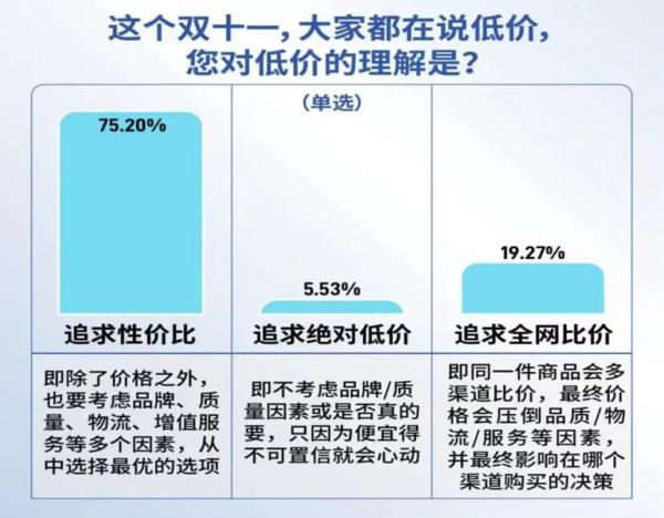 所谓“反向消费”,意思是消费者不再固执认为贵就是好,也不会片面追求绝对的便宜,而是既看重品牌品质又要求性价比。就像今年双11前夕,有媒体调查了大家对于低价的理解,有75%的年轻人认为性价比才是真正的低价。