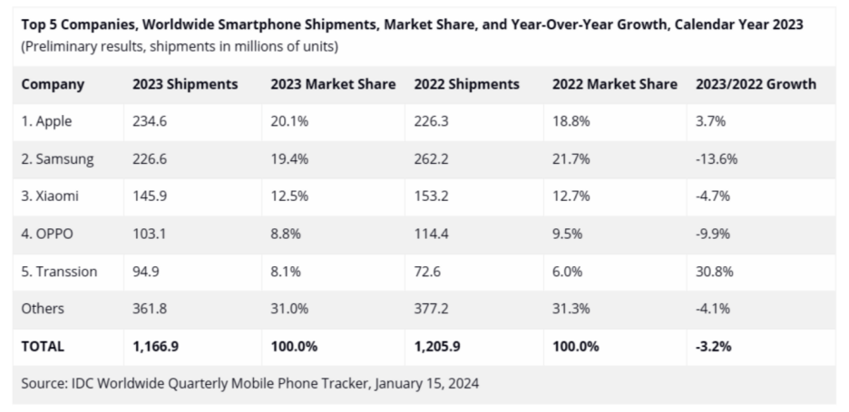 OPPO和传音分别以8.8%、8.1%的市占率排名第四及第五,两者出货量具体表现为“一减一增”,OPPO的出货量为1.03亿部,同比减少9.9%,在前五名中的出货量下跌幅度仅次于三星。传音则为9490万部,同比增长30.8%,一举超越vivo,首次跻身全球智能手机市场年度出货量前五名。