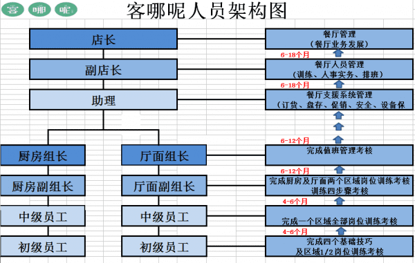 客哪呢地道的云南口味不仅在当地颇有知名度,还在专业评审中获得了中国金牌旅游小吃的称号。目前在昆明开设了九家直营店,每个店有 18-22 个人不等。之前店里组织结构是这样的,设有一个店长,店长底下设一个助理,其他员工按照 1-12 分级,每升一个级别,工资会有一定的提升。