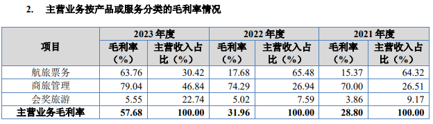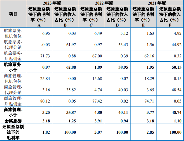 而在招股书自身包装上,美亚科技声称自己为泛商旅出行服务商。但从实际业务来看,其本质上还是一家机票代理商。还原至总额法下,2021—2023年航旅票务业务收入占比分别为50.15%、58.95%、62.88%;商旅管理业务收入占比分别为48.74%、40.11%、35.87%;会奖旅游业务收入占比分别为1.10%、0.94%、1.25%。
