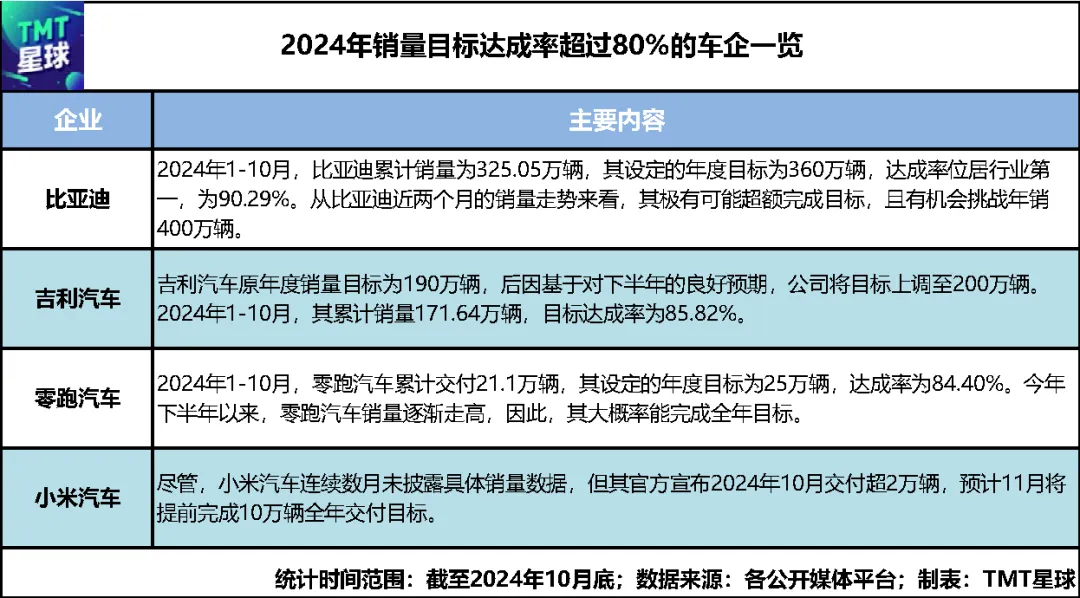 但「TMT星球」梳理发现,截至2024年10月末,仅有比亚迪、吉利、零跑等极少数车企完成了全年目标销量的80%。
