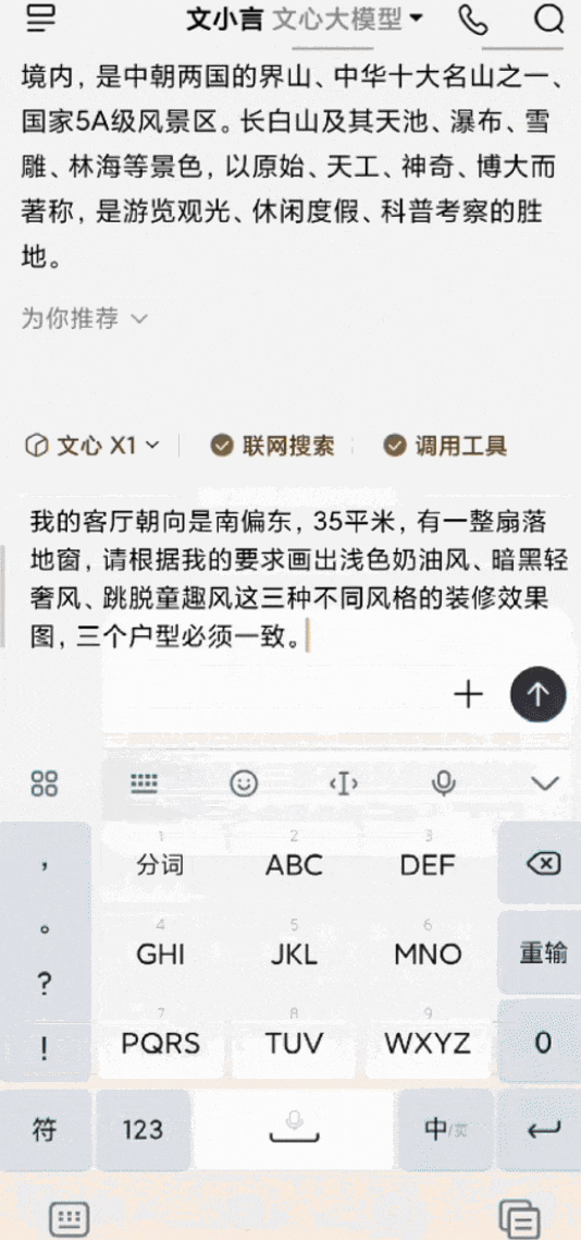 还有个非常常见的场景,家里客厅装修,有一整扇落地窗,想参考几个不同的风格设计。用白话给文小言输入提示词后,文心X1会进行深度思考,然后调用搜索、画图等多种工具,最后生成多张效果图,每张都附有该风格的设计说明,图文混排输出,清晰明了。