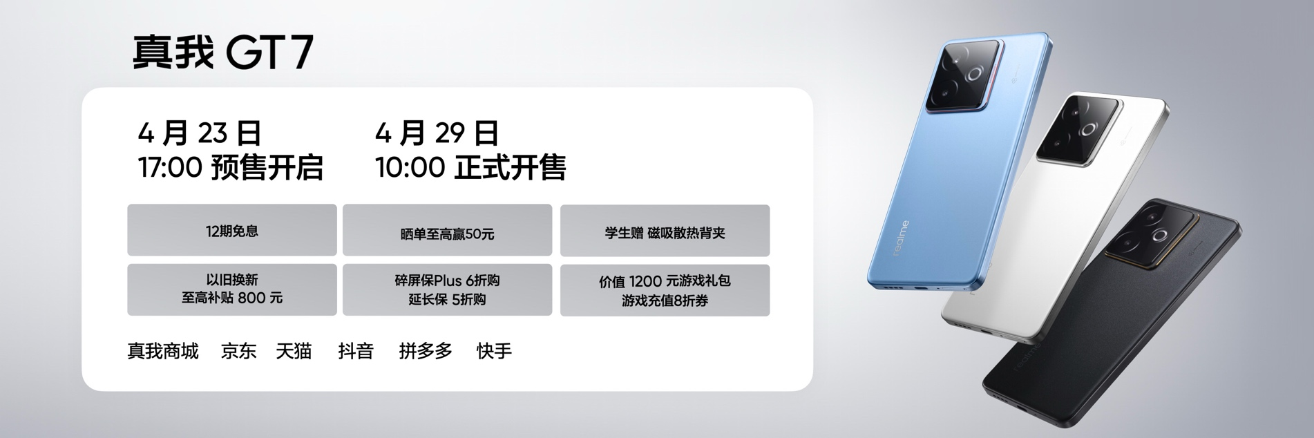 真我GT7现已正式开启预售,4月29日10点全渠道现货开售,价保618。购机可享至高12期免息分期,换新补贴最高800元,老用户以旧换新至高享200元额外补贴。