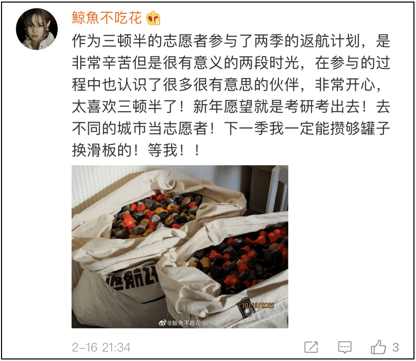 返航计划从2019年第一季的17个城市,29个空罐回收点,到今年二月刚结束的第三季,已经扩展到43座城市,64个返航点,20000名参与者,140.09万个空罐。在新浪微博#返航计划#话题阅读数高到7256万,讨论量4.7万。