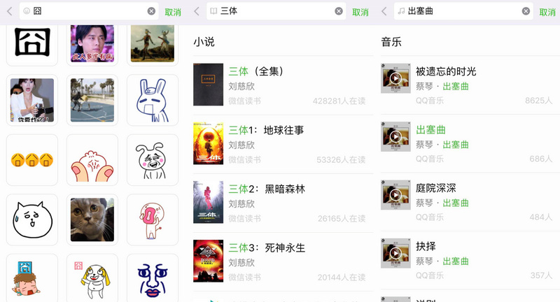 值得注意的是,除了精品店之外,搜一搜的入口也在悄然无息地变得越来越丰满。版本升级前,搜一搜就具备了搜索朋友圈、资讯、公众号、小说、音乐、表情等功能,搜索结果比百度的看起来更为干净、清爽。