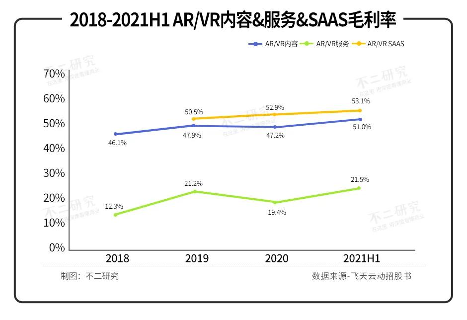 2018-2020年及2021上半年,AR/VR内容的毛利率为46.1%、47.9%、47.2%、51.0%;AR/VR服务的毛利率为12.3%、21.2%、19.4%及21.5%。