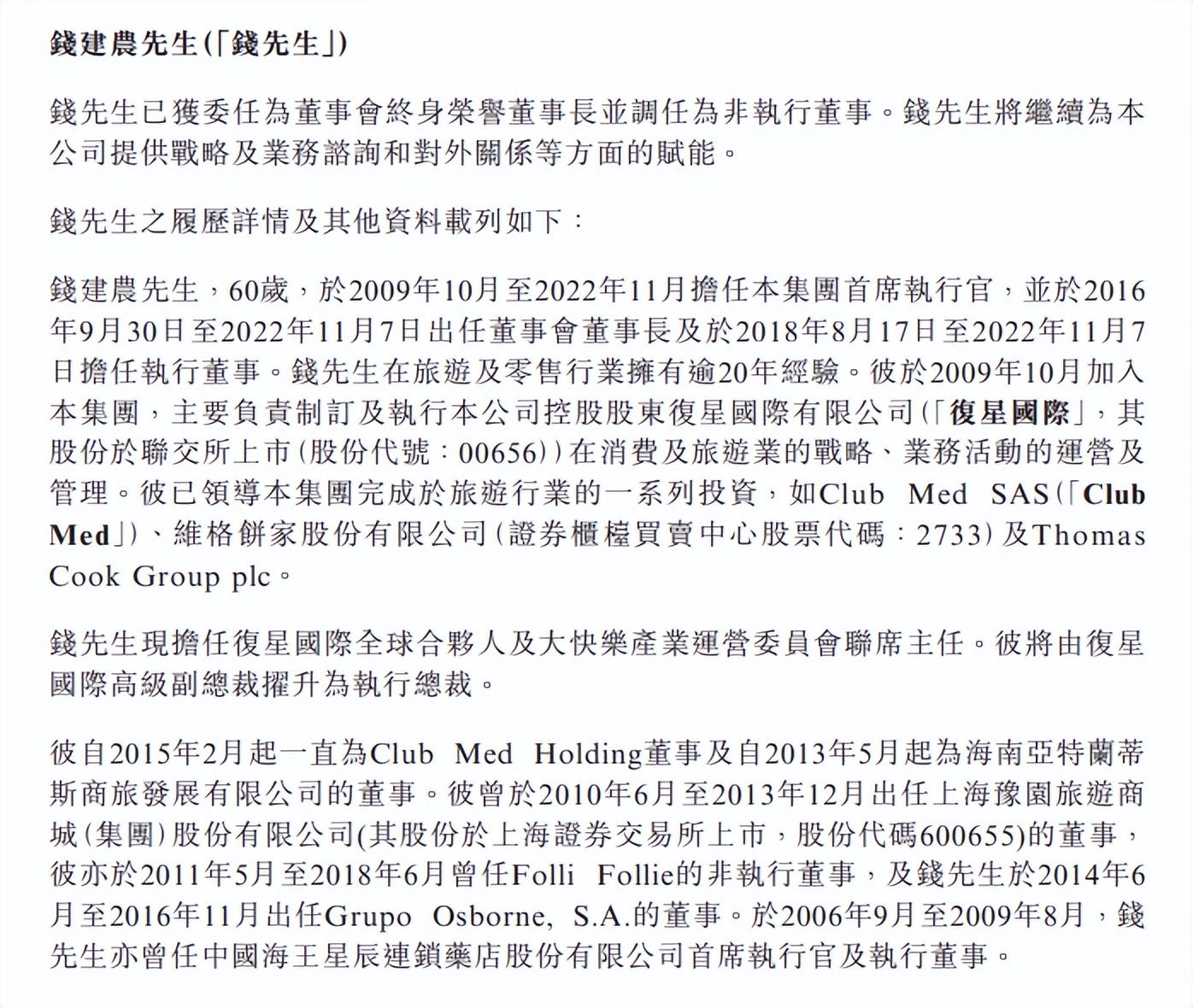相关资料显示,今年60岁的钱建农于2009年10月加入复星,主要负责制订及执行复星旅游文化控股股东复星国际有限公司在消费及旅游业的战略、业务活动的运营及管理。并于2016年9月30日出任董事会董事长,2018年8月17日起担任执行董事。
