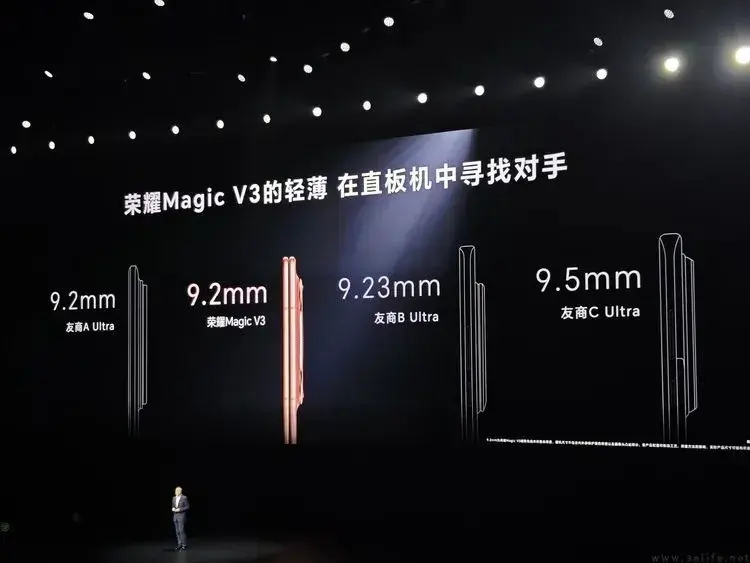 荣耀在上代产品Magic V2以9.9mm机身厚度,让折叠屏进入毫米级时代的基础上,本次Magic V3以9.2mm机身厚度再次碾压友商的直板机旗舰。在重量上,Magic V3在继承了鲁班铰链的同时,依托19种新型高能材料的进一步减重,以226g的重量“打平”了华为Pura 70 Ultra。