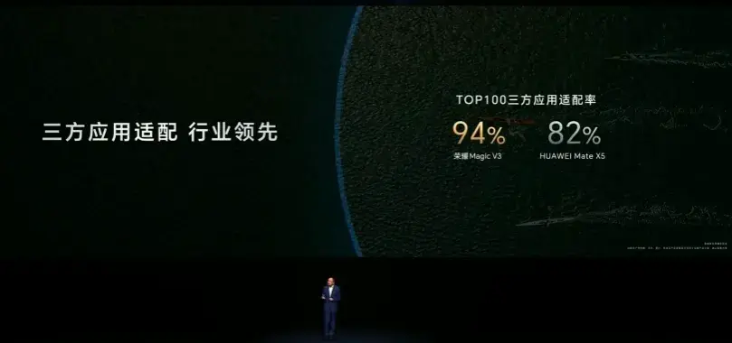 如何提供这个价值?就要通过软件能力来实现,“APP适配”则是最重要的一环。在这一点上,荣耀比华为还积极。荣耀Magic V3本次不仅完成了94%的TOP100的三方应用适配,还给了自适应适配引擎来解决长尾问题。