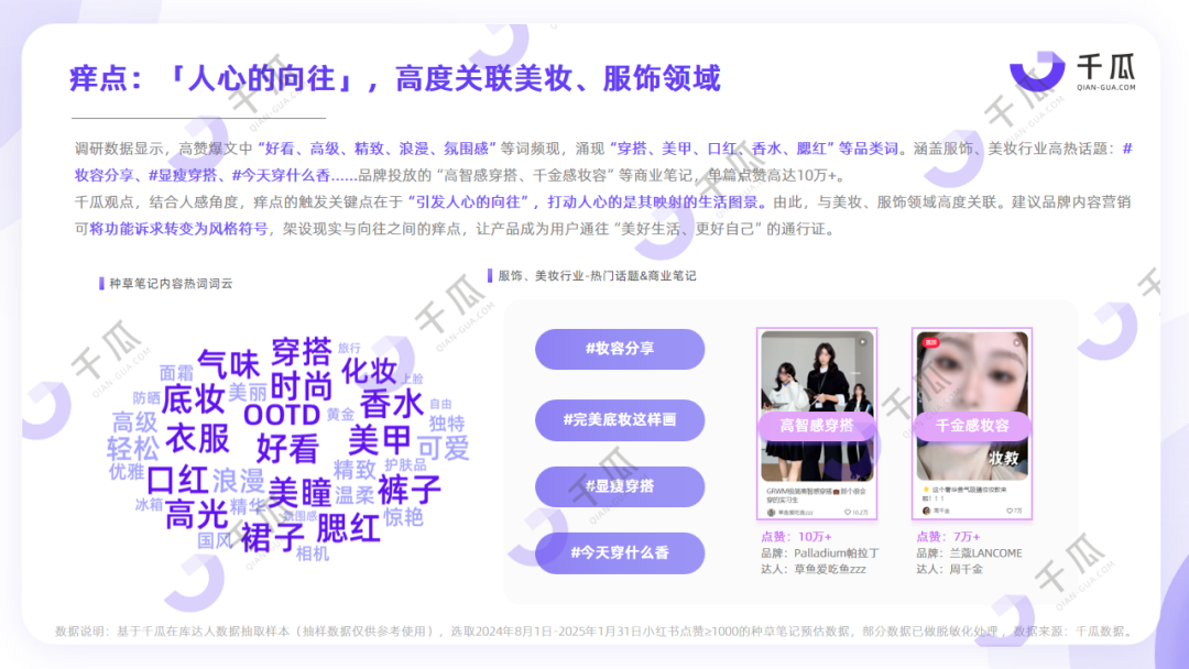 痒点:触发根本通常是「人心的向往」,美妆、服饰领域可借此打造爆点。营销需将功能卖点转变为风格符号,笔记内容与产品呈现注重“美感、质感、氛围感”,以产品意象打动人心。