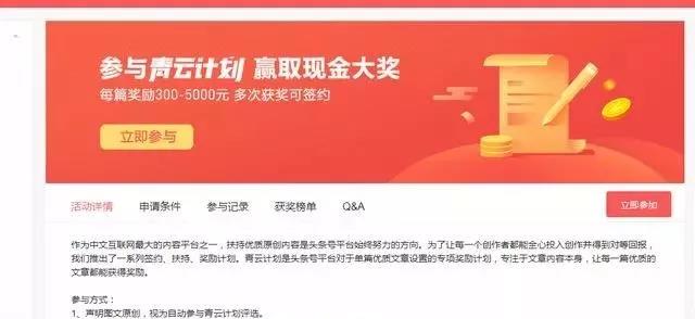 头条这个平台有一点好处就是没有新手期,注册就开通了收益,很多人会说头条单价低呀,但是过了头条原创之后,可以参加头条的青云计划,很多自媒体人都是通过参加平台的活动赚钱的。