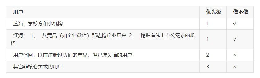 解读:挖掘有线上办公需求的机构和个人,意思是说之前的企业通讯软件现在也是有的,所以对于我们新的产品需要整一个不同的切入点,这里需要找之前没有使用过IM产品的公司。比如手工业,制造业,餐饮业等等。需要协作软件在线报告信息。